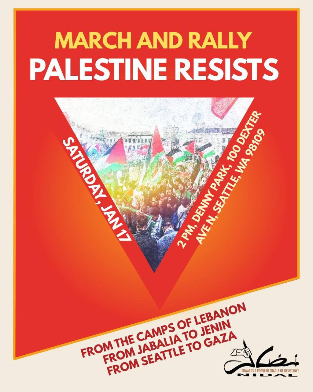 Nidal Seattle called upon all to participate in a mass march and rally for Palestine on Saturday, January 17 at 2 pm in Denny Park. The call to action reads: