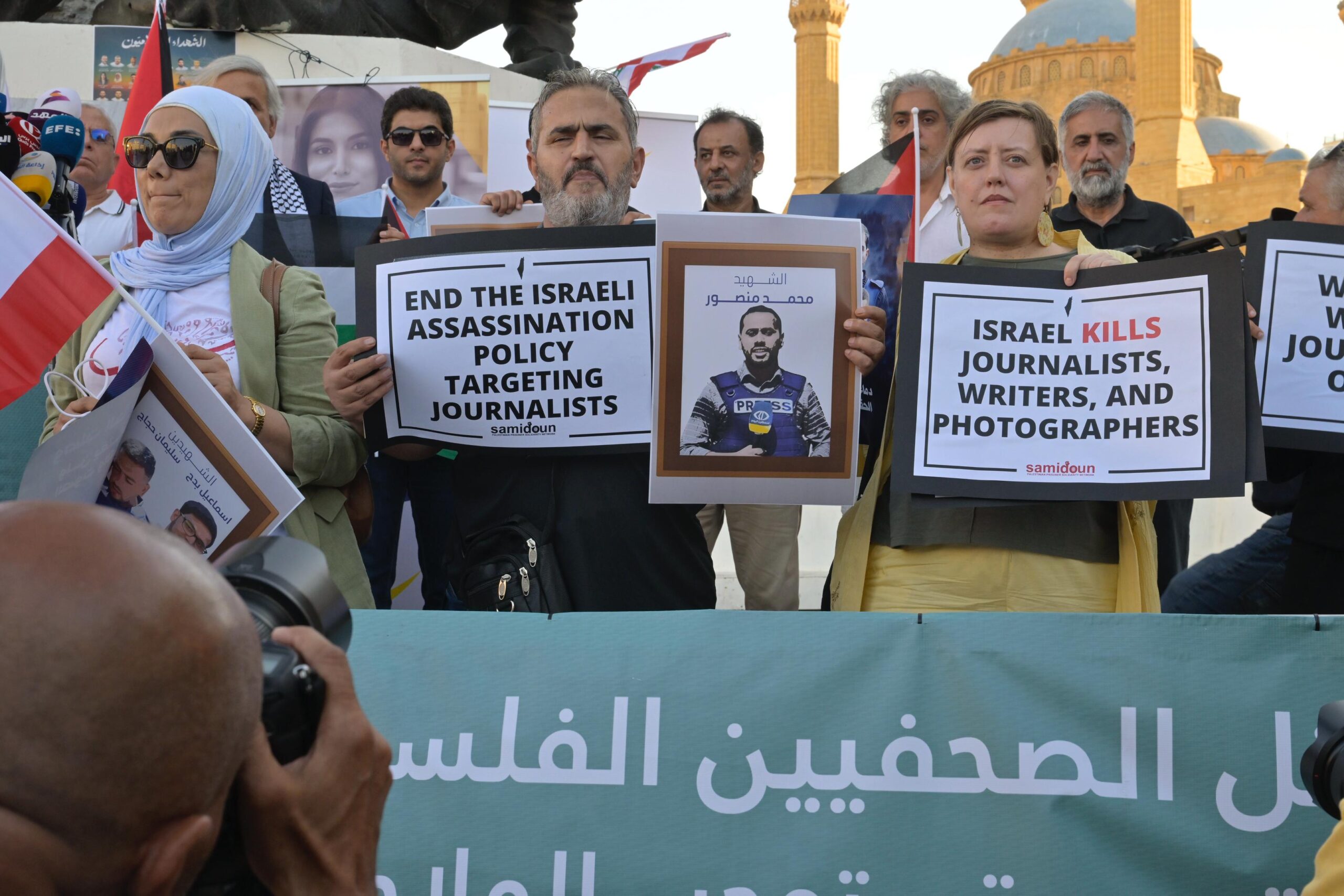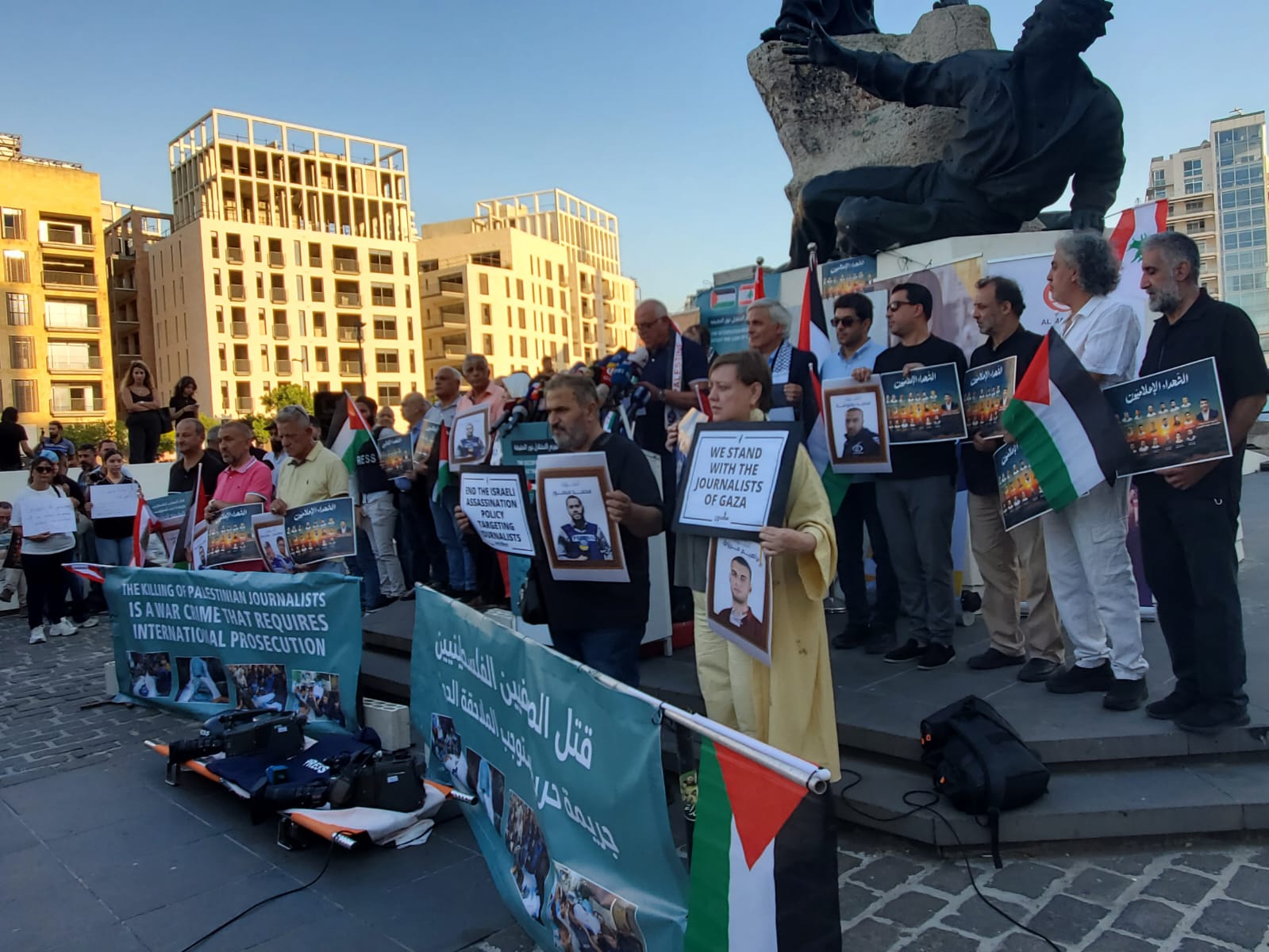 La «Plaza de los Mártires» de Beirut fue escenario, el lunes por la tarde, de una vigilia de solidaridad, convocada por trabajadores de prensa de los medios de comunicación libaneses y palestinos, en apoyo a los periodistas en la Franja de Gaza que enfrentan asesinatos, bombardeos y asedios a manos de las fuerzas de ocupación sionistas.