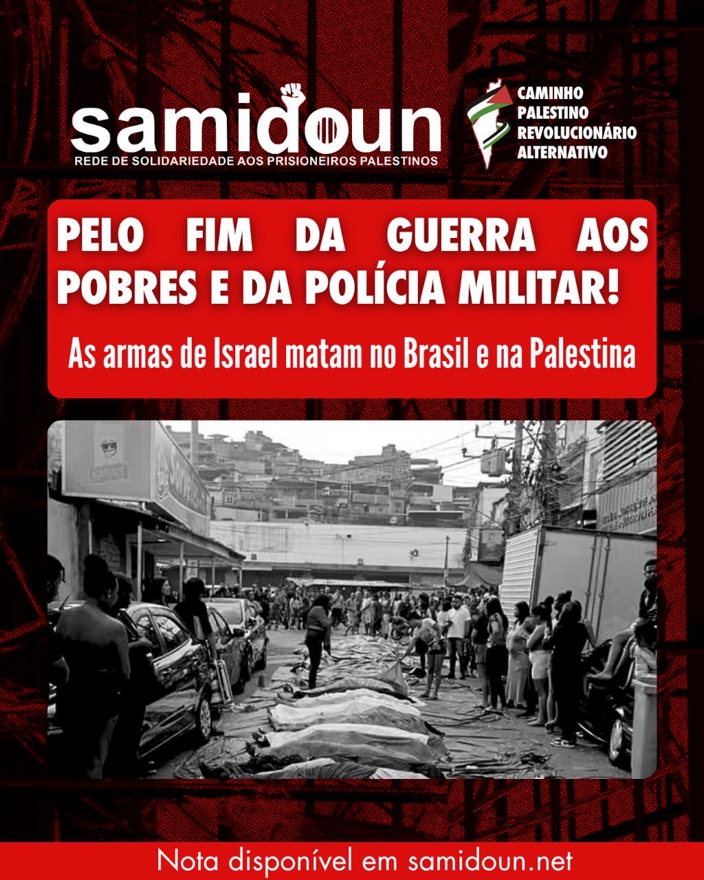 A Samidoun – Rede Internacional de Solidariedade aos Prisioneiros Palestinos e o Masar Badil se solidarizam com cada família vítima da violência do Estado brasileiro, com cada morador de favela e dos bairros afetados pelas operações policiais. O objetivo dessas operações nunca foi a segurança ou a paz, mas alimentar o medo e o pânico moral que depois é instrumentalizado pela extrema-direita.